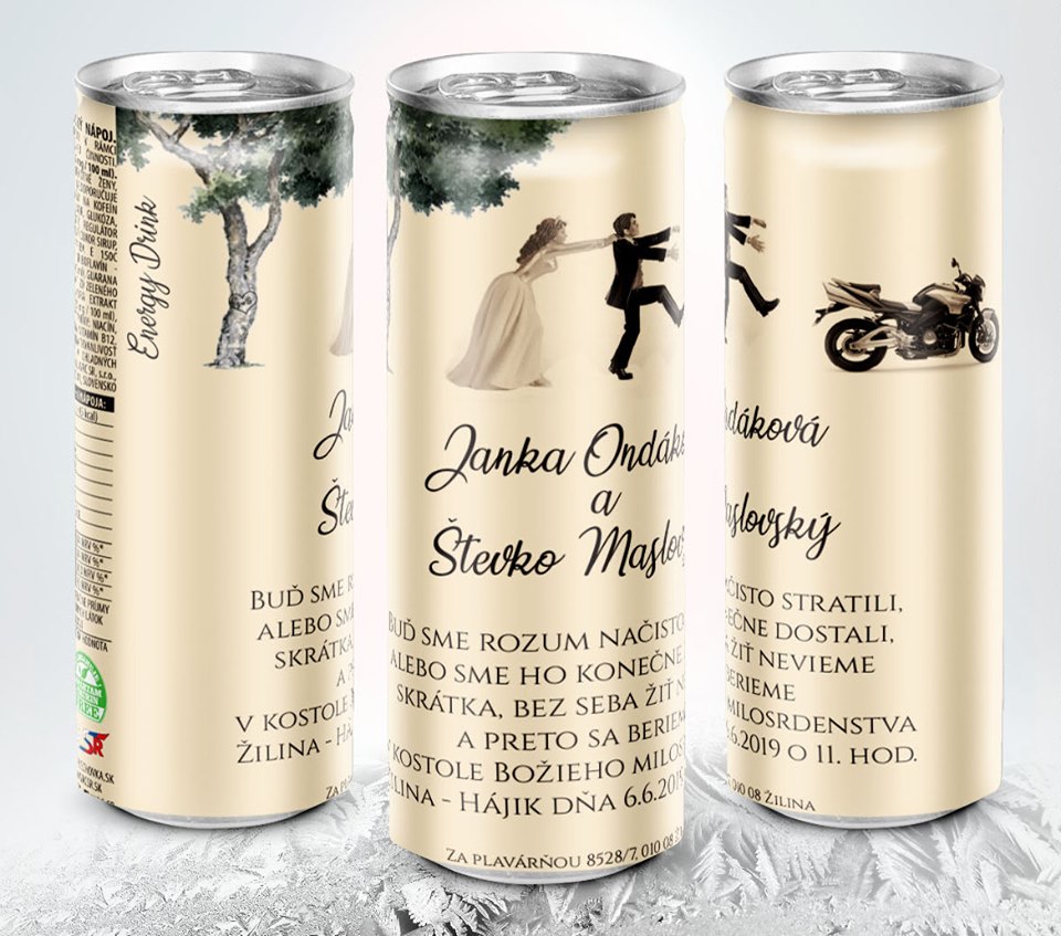Dejte si pro své svatební hosty vyrobit vlastní nápoje s originálním potiskem, která bude připomínat svatební den. Sami si můžete navrhnout design plechovky – je jen na vás, co bude na plechovce vytištěny. Pokud máte jen svou představu – nevadí. Grafici se už postarají o grafický návrh.